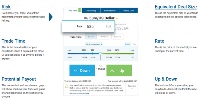 . Inoltre, puoi negoziare senza requisiti di margine, spread zero e con un importo di rischio che imposti e bloccato prima di negoziare. Anche veloce, fai uno scambio in 4 semplici passaggi: scegli il tuo strumento, decidi l'importo del rischio, la durata dello scambio e se vuoi “comprare” o “vendere”. La società ti offre un altro strumento di trading unico il tasso di congelamento che ti consente di congelare il prezzo che vedi. Questo ti dà un buffer di pochi secondi per eseguire il tuo trade.