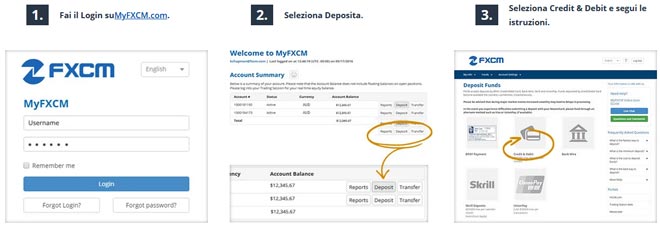FXCM offre molteplici opzioni di trasferimento del denaro per l'apertura del conto velocemente e in modo sicuro.I trader possono scegliere di depositare i fondi attraverso carta di credito/debito, bonifico, Skrill, Neteller.