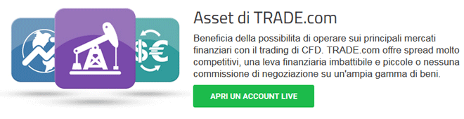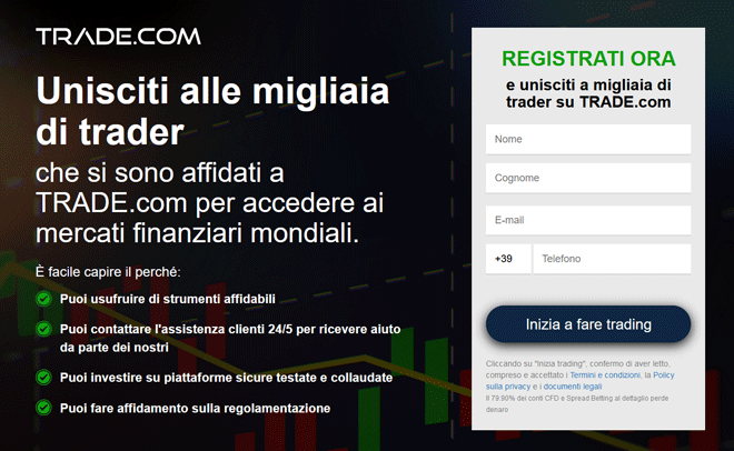 Fare trading con il Broker TRADE.com è sicuro ed affidabile. Le piattaforme disponibili sono le migliori in circolazione, ottimo anche il numero degli asset disponibili e la possibilità di aprire un conto di trading con soli 100 euro.