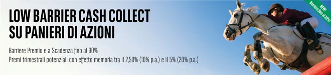 BNP Paribas annuncia l'emissione di una nuova serie di Certificate Low Barrier Cash Collect su panieri di azioni. I nuovi strumenti offrono un premio potenziale trimestrale tra il 2,50% (10% p.a.) e il 5% (20% p.a.) con effetto memoria e hanno barriere premio e a scadenza che coincidono, poiché fissate entrambe fino al 30% del valore iniziale delle azioni sottostanti.
