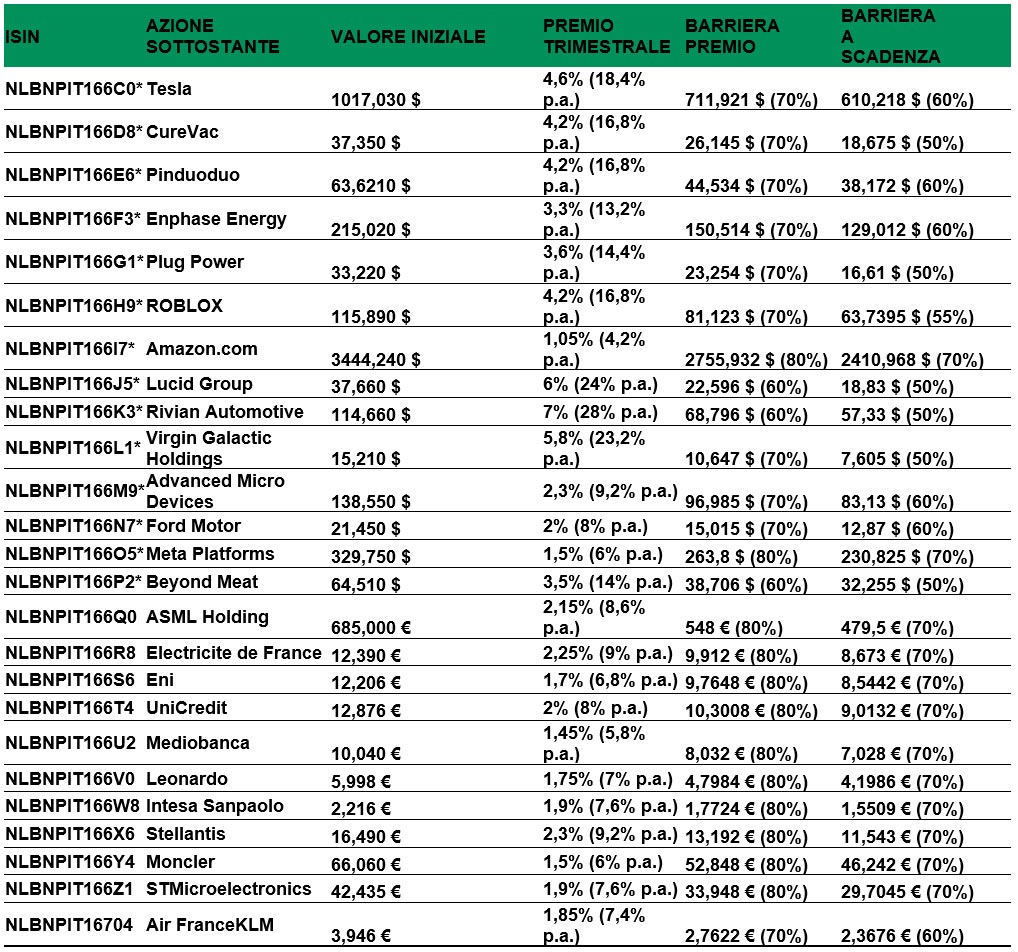 I nuovi Memory Cash Collect si distinguono per il sottostante che, dopo una serie di emissioni su panieri di titoli, torna in quest’emissione ad essere su singole azioni, europee ed americane, come ad esempio Tesla, Amazon, Meta Platforms, Beyond Meat, e alcune tra le maggiori società quotate italiane, quali Eni, UniCredit, Mediobanca, Leonardo, Intesa Sanpaolo, Stellantis, Moncler. Spicca inoltre la novità Rivian Automotive, società recentemente quotata al Nasdaq impegnata nello sviluppo della viabilità elettrica.