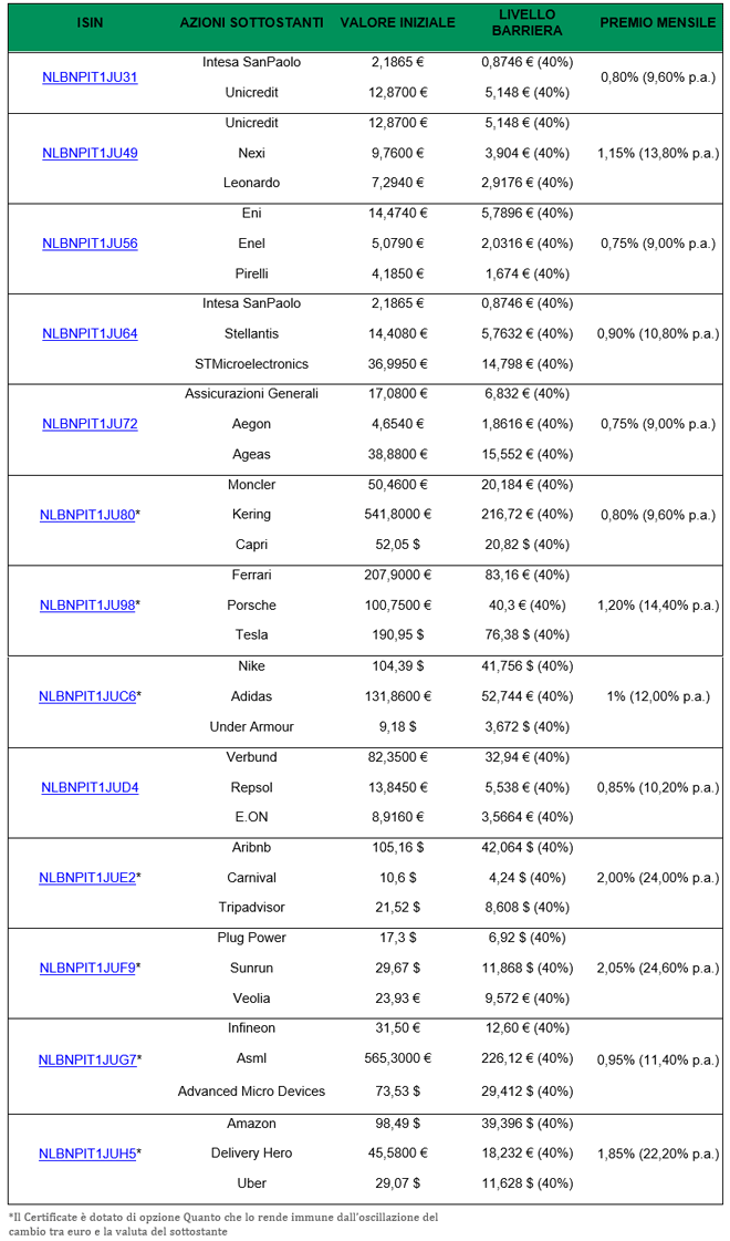 Ad esempio, il Low Barrier Cash Collect su Intesa e Unicredit (NLBNPIT1JU31) pagherà un premio mensile pari allo 0,8% (9,6% p.a.) del valore nominale ad ogni data di valutazione intermedia in cui il valore delle azioni sottostanti sia maggiore o uguale al livello Barriera Premio, posto al 40% ovvero rispettivamente pari a € 0,8745 per Intesa Sanpaolo e € 5,148 per Unicredit. Inoltre, a partire dal sesto mese di vita del prodotto, nel caso in cui in una delle date di valutazione mensili tutte le azioni che compongono il paniere quotino a un valore pari o superiore al rispettivo valore iniziale (rispettivamente € 2,1865 e € 12,8700), il Certificate scade anticipatamente e, oltre al pagamento del premio, rimborsa anche il valore nominale (100 €) e gli eventuali premi non pagati in precedenza, grazie all’effetto memoria. L’effetto memoria entra in gioco anche se il certificate giunge a scadenza: in questo caso infatti, qualora la quotazione di tutte le azioni che compongono il paniere è pari o superiore al Livello Barriera a Scadenza, il Certificate paga il valore nominale sommato al premio più gli eventuali premi non pagati precedentemente. Se la quotazione di almeno una delle due azioni che compongono il paniere del certificato è inferiore al livello Barriera a Scadenza, il Certificate paga un importo commisurato alla performance della peggiore tra le due azioni che compongono il paniere (con conseguente perdita, parziale o totale, del capitale investito).