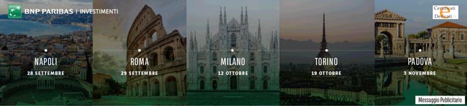 BNP Paribas annuncia l’avvio del proprio roadshow dal titolo “Investimenti in tour. Mercato, strumenti, investimenti: teoria e pratica” che dal mese di settembre toccherà cinque delle principali città italiane: Napoli, Roma, Milano, Torino, Padova. Gli eventi sono organizzati in collaborazione con Certificati e Derivati.