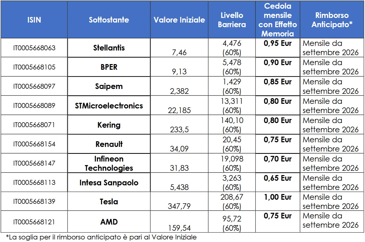 In una fase di mercato caratterizzata da massimi storici degli indici, volatilità intermittente e tensioni geopolitiche, avere la certezza di incassare cedole fisse per 12 mesi rappresenta un vantaggio concreto. La barriera al 60% per i certificati mono-azione e al 50% per i basket fornisce una protezione ulteriore, riducendo il rischio di perdite in caso di calo dei titoli.