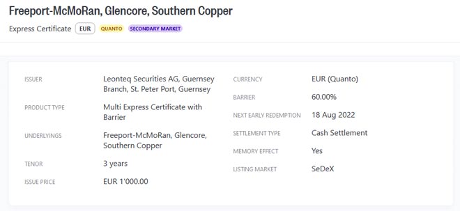 Si tratta del prodotto con codice ISIN CH1143303001, un certificato Phoenix Autocallable su Freeport-McMoRan, Glencore e Southern Copper, ideato appunto per chi cerca di investire sul settore mining e commodities.