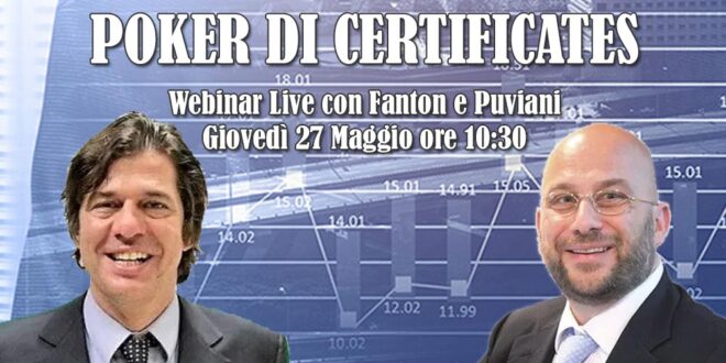 Proseguono gli appuntamenti con i live streaming “Poker di Certificates“, il corso gratuito sui Certificati di Investimento organizzato dal portale investire-certificati.it e l'emittente svizzero Leonteq.