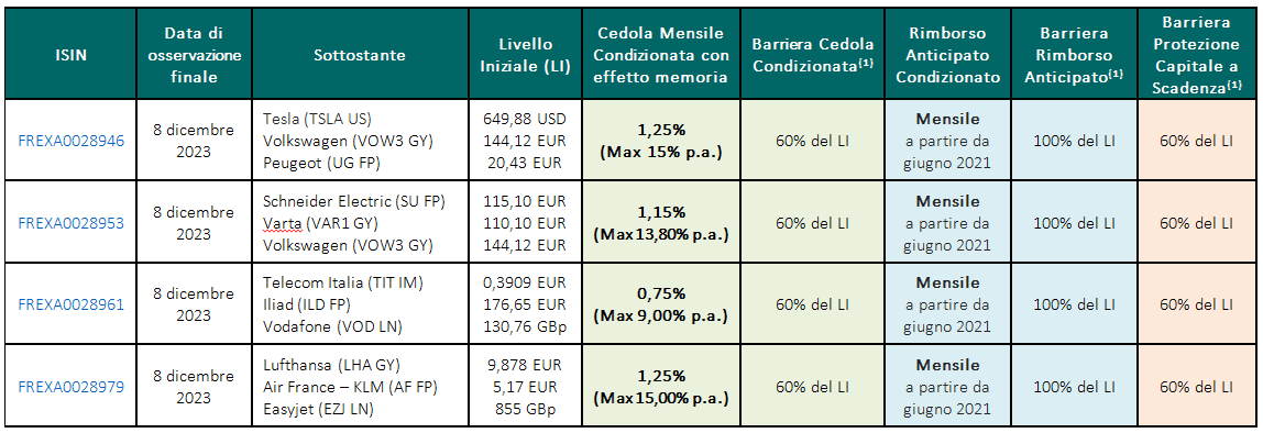 I nuovi certificati hanno una scadenza pari a 36 mesi e prevedono la possibilità di rimborso anticipato mensile condizionato a partire da giugno 2021 a patto che tutti i titoli sottostanti siano sia superiori al loro livello iniziale.