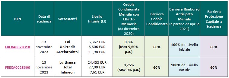 La maggiore protezione del capitale lascia comunque spazio a buoni livelli di rendimento. La nuova gamma prevede infatti Cedole Condizionate Mensili con rendimenti del 9,00% e 9,60% annualizzato a seconda delle soluzioni. Entrambi i nuovi prodotti comprendono Barriere Europee per la protezione del capitale poste al 60% dei livelli iniziali e possibilità di Rimborso Anticipato Mensile a partire dal 6° mese di vita del prodotto.