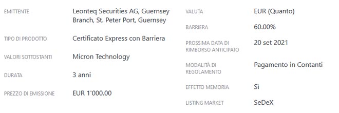 Dopo aver parlato del certificato di Leonteq su tre Big cap di Piazza Affari (BPER Banca, Eni e Stellantis) e il certificates su Tesla, fra le nuove emissioni di Leonteq troviamo il certificato con ISIN CH0599556963, negoziabile sul SeDex. Questo certificates è legato ad un unico sottostante, Micron Technology, azienda americana con sede a Boise, in Idaho, operativa nel settore dei dispositivi a semiconduttore, tra cui memorie Flash e Memorie Dram.