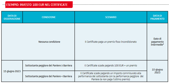 - se il valore dell'azione sottostante con la performance peggiore del Paniere è inferiore al livello Barriera, viene corrisposto un valore commisurato alla performance dell'azione sottostante con la performance peggiore del Paniere (caratteristica Worst Of), senza inoltre pagare l'ultimo premio: in questa ipotesi, i Certificate non proteggono il capitale investito.