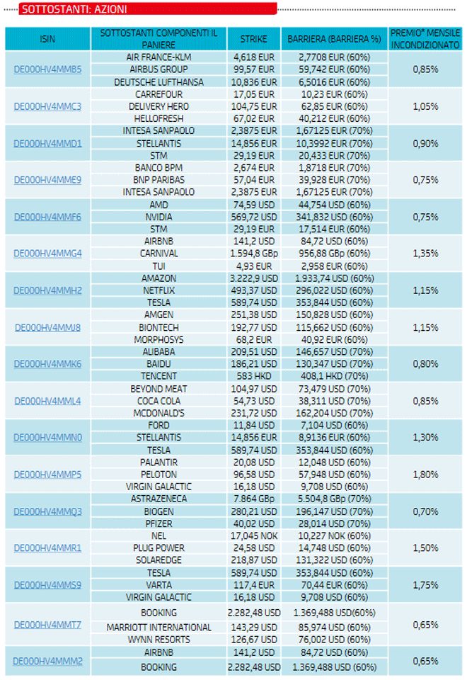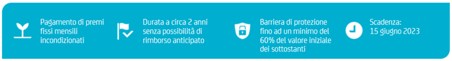 I nuovi prodotti hanno come sottostante panieri composti da due o tre azioni italiane ed internazionali, hanno una scadenza a 2 anni (15 giugno 2023) e pagano un premio fisso mensile incondizionato che va da un minimo dello 0,65% ad un massimo dell’1,80% a seconda dei sottostanti. Il livello di Barriera varia dal 60% al 70% del valore iniziale.