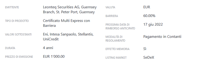 I prezzi di osservazione iniziale sono pari a 10,63 euro per le azioni di Eni (barriera a 6,378 euro), 2,4165 euro per Intesa (con barriera a 1,4499 euro), 16,958 per Stellantis (con barriera a 10,175 euro) e 10,472 per Unicredit (con barriera a 6,283 euro).