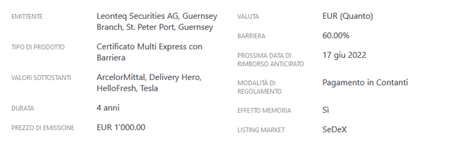 Il secondo certificato con welcome coupon ha ISIN CH1117919063. I sottostanti in questo caso sono le azioni di ArcelorMittal, Delivery Hero, HelloFresh e Tesla (Leonteq ha emesso a febbraio anche certificates su Tesla con codice ISIN CH0587330124)