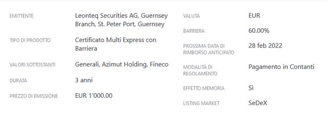 Dal punto di vista operativo i prezzi di osservazione iniziale sono pari a 16,815 euro per Generali, 20,33 euro per Azimut Holding e 13,735 per Fineco. Sia la barriera capitale che quella cedolare sono posizionate al 60% di tali valori. Pertanto, per Generali questo valore è posizionato a 10,089 euro, per Azimut a 12,195 euro e a 8,241 euro per Fineco.