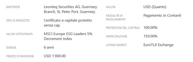 Fra le nuove emissioni di Leonteq troviamo un certificato di investimento a capitale protetto con partecipazione su MSCI Europe ESG leaders. Il certificato ha codice ISIN CH1107638533 ed ha una durata pari a 6 anni, con la scadenza fissata per il 30 aprile 2027. È negoziato sull'Euro TLX.