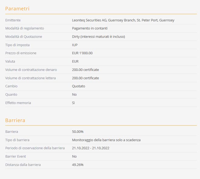 Va poi segnalato come l'emittente svizzero, quotato sin dal 2012 sulla Borsa di Zurigo, si sia riservato anche l'approvazione per presentare prodotti anche nel segmento leverage, con Minifuture, Warrant e Knock Out Warrant.
