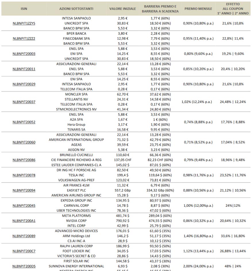 Ad esempio, il certificato su Intesa, Banco BPM e Unicredit (NLBNPIT1ZZY5) offre un premio mensile dello 0,9% dell’Importo Nozionale, con la possibilità di un rimborso anticipato che include, oltre all’Importo Nozionale, tutti i premi mensili futuri e quelli non pagati precedentemente.