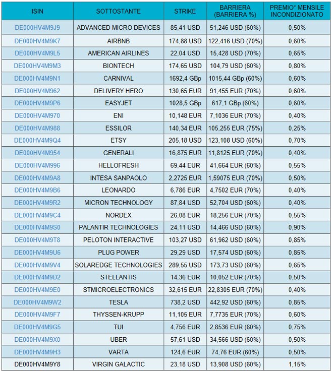I nuovi Certificate hanno come sottostanti singole azioni italiane, europee ed americane, hanno una scadenza a 3 anni (giugno 2024) e pagano un premio fisso mensile incondizionato che va da un minimo dello 0,25% ad un massimo dell’1,15% a seconda dei sottostanti. Il livello di Barriera varia dal 60%al 75% del valore iniziale.