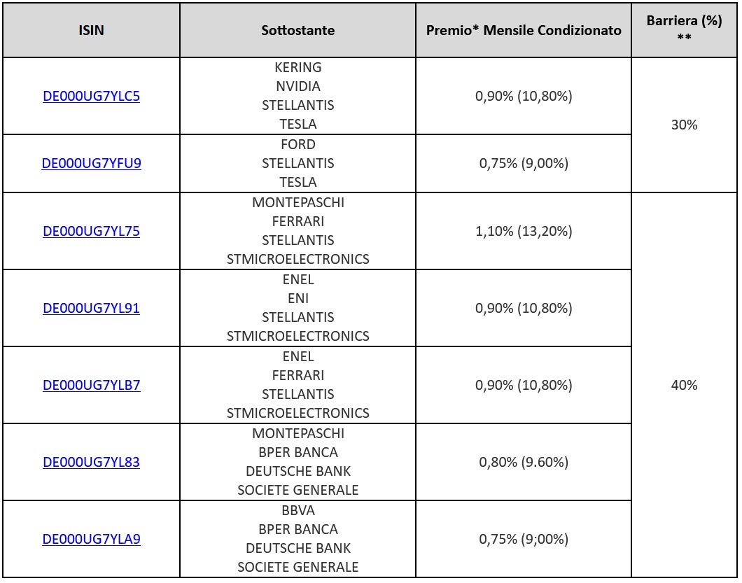 - Mix settoriale internazionale: DE000UG7YLC5 che include titoli come Kering, Nvidia, Stellantis e Tesla, barriera al 30% e premio mensile dello 0,90%.