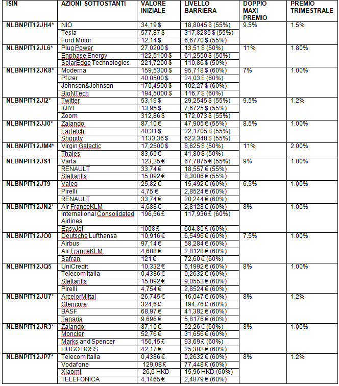 L’altra novità riguarda i sottostanti. Infatti, tra i 14 Certificate su panieri worst-of di azioni dell’emissione, 6 sono su sottostanti americani. In particolare troviamo i seguenti panieri su azioni US: Nio – Tesla – Ford, Twitter – IQIYI – Zoom, Moderna – Pfizer – J&J – BioNTech, Plug Power – Enphase Energy – Solar Edge Technologies, Farfetch – Shopify – Zalando (quest’ultima non US), Virgin Galactic – Thales (quest’ultima non US). Inoltre, i Certificate su sottostanti americani sono quotati in Euro e tutti dotati dell’opzione Quanto, per cui l’investitore non è esposto al rischio del tasso di cambio tra Euro e Dollaro.
