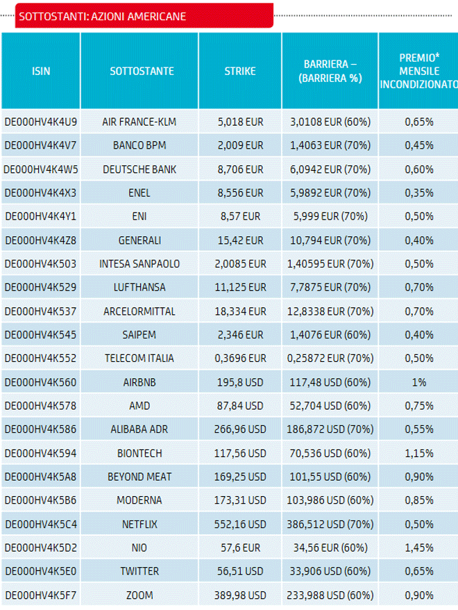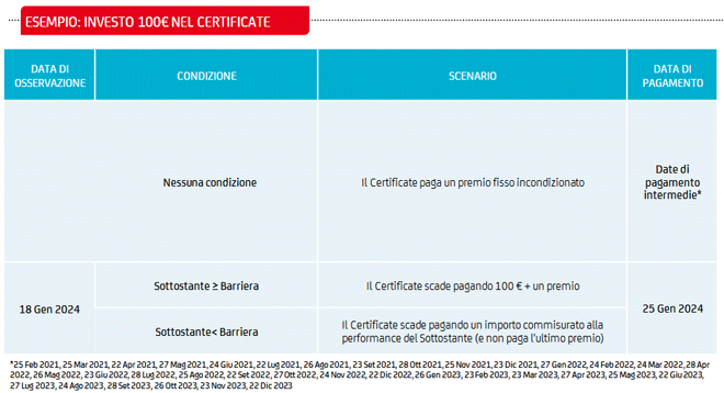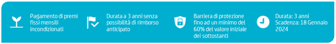 I nuovi Certificate hanno come sottostanti singole azioni italiane, europee ed americane, hanno una scadenza a 3 anni (gennaio 2024) e pagano un premio fisso mensile incondizionato che va da un minimo dello 0,35% ad un massimo dell’1,45% a seconda dei sottostanti. Il livello di Barriera è variabile e va dal 60% al 70% del valore iniziale.