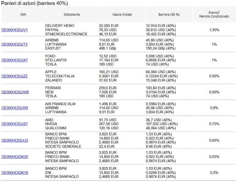 Prendiamo ad esempio il Certificate DE000HC63JV1, basato su un paniere di azioni composto da PAYPAL, DELIVERY HERO e STMICROELECTRONICS. Esso prevede una barriera a scadenza del 40% e un premio mensile dell’1,35%, corrispondente a un rendimento annualizzato del 16,20%. Se il Certificate non dovesse scadere anticipatamente, alla data di osservazione finale, ovvero dicembre 2025, e il sottostante peggiore dei tre avesse un valore pari o superiore al 40% del valore iniziale, il Certificato verrebbe rimborsato al valore nominale di 100€, con l’aggiunta di 1,35€ di premio (oltre ai premi eventualmente non pagati in precedenza). Invece, se il sottostante peggiore dei tre perdesse più del 60% del valore iniziale e si posizionasse sotto la barriera posta al 40%, il certificato rimborserebbe un valore proporzionale alla performance del sottostante.