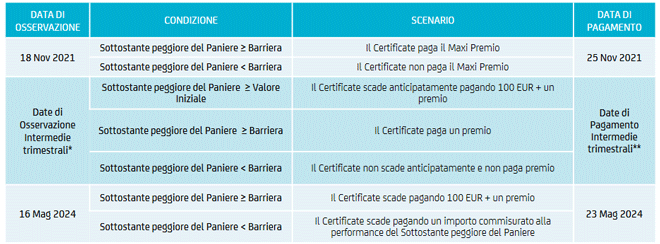 Inoltre, a partire dal 6° mese e nelle date di osservazione trimestrali, nel caso in cui il valore dell’azione sottostante facente parte del paniere con la performance peggiore raggiunga un valore superiore a quello iniziale, il relativo Certificate viene rimborsato anticipatamente, con un importo pari al valore nominale (di 100€) più il premio.