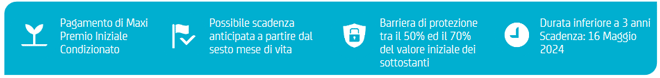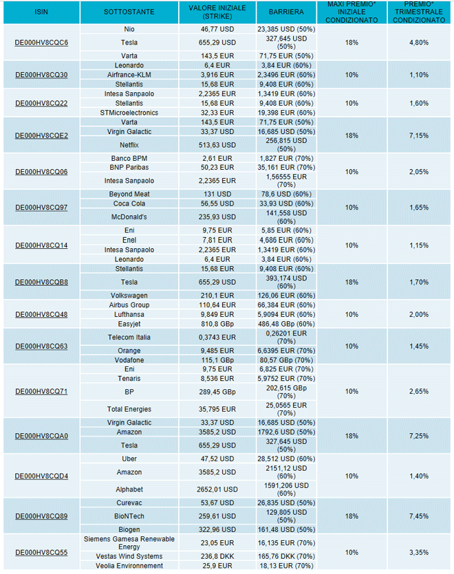 I nuovi Certificate hanno come sottostante panieri composti ciascuno da azioni, italiane ed internazionali, hanno una scadenza inferiore ai 3 anni (maggio 2024) e pagano un Maxi Premio Iniziale Condizionato che va dal 10% al 18% a seconda dei sottostanti che compongono i rispettivi panieri. Il livello di Barriera è stato fissato tra il 50% ed il 70%. Le scelte delle azioni di ciascun paniere sono state effettuate per dare la possibilità di investire in un settore specifico, come per esempio il paniere food, composto da Beyond Meat, Coca Cola e McDonald’s che propone un rendimento condizionato trimestrale dell’1,65% dopo il Maxi Premio Iniziale Condizionato del 10% o il paniere sui titoli banking, composto da BNP Paribas, Banco BPM e Intesa Sanpaolo che offre un rendimento condizionato trimestrale del 2,05% dopo il pagamento del Maxi Premio Iniziale Condizionato del 10%.