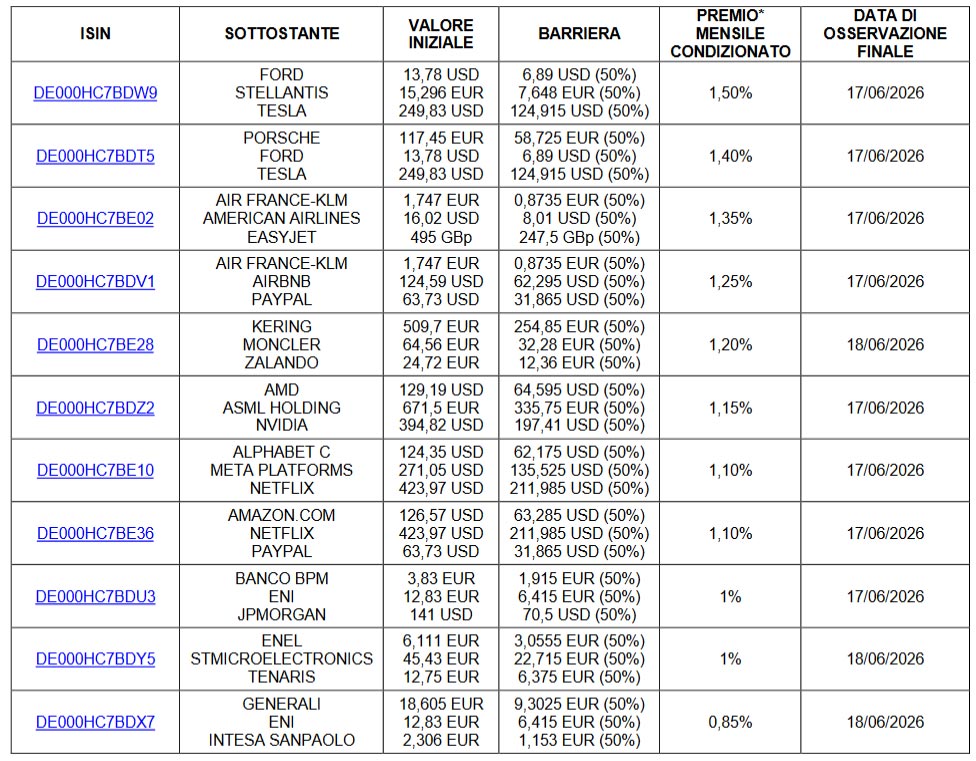 I Certificati della serie offrono la possibilità di guadagnare rendimenti mensili condizionati con effetto memoria, a patto che il Prezzo di Riferimento del Sottostante alla Data di Osservazione mensile sia uguale o superiore al Livello Barriera, fissato per questa emissione al 50% del Valore Iniziale. Il range di rendimenti mensili varia dallo 0,85% per il paniere composto da Assicurazioni Generali, Eni ed Intesa Sanpaolo, all’1,50% lordo per il paniere automotive con Ford, Stellantis e Tesla.