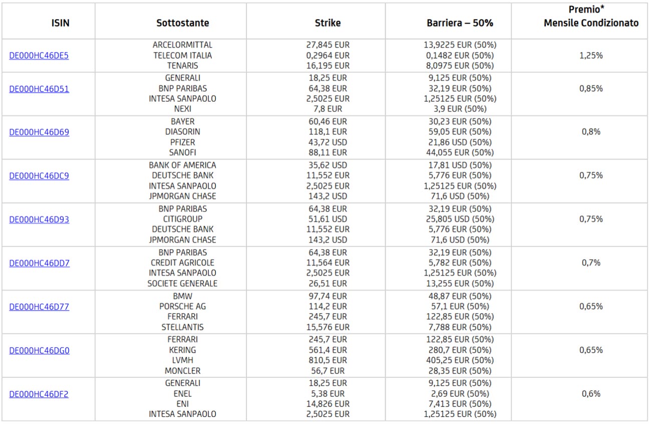 UniCredit emette 18 nuovi Cash Collect su panieri di azioni che prevedono premi mensili condizionati con effetto memoria, possibilità di scadenza anticipata a partire da novembre 2023 con effetto Step-Down e barriera a scadenza compresa tra il 40% e il 50%.