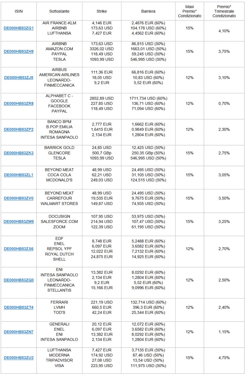I panieri sono stati pensati per offrire agli investitori diverse possibilità di investimento: si trovano infatti panieri costruiti su quattro titoli americani tecnologici, come Airbnb, Amazon, Paypal e Tesla, che presenta una barriera al 50%, un Maxi Premio iniziale del 15% e premi successivi del 3,75% e panieri più conservativi costruiti su titoli italiani come il paniere costruito su Intesa Sanpaolo, BPER e Banco BPM, con una barriera posta al 60%, un Maxi Premio del 12% e premi successivi del 2,30%. Tra i numerosi prodotti portati in quotazione sono presenti anche dei panieri tematici come il paniere costruito su titoli legati al lusso – Tod’s, Ferrari e LVMH, che prevede un Maxi Coupon iniziale del 12%, un premio trimestrale condizionato del 2,40% ed una barriera al 60%.