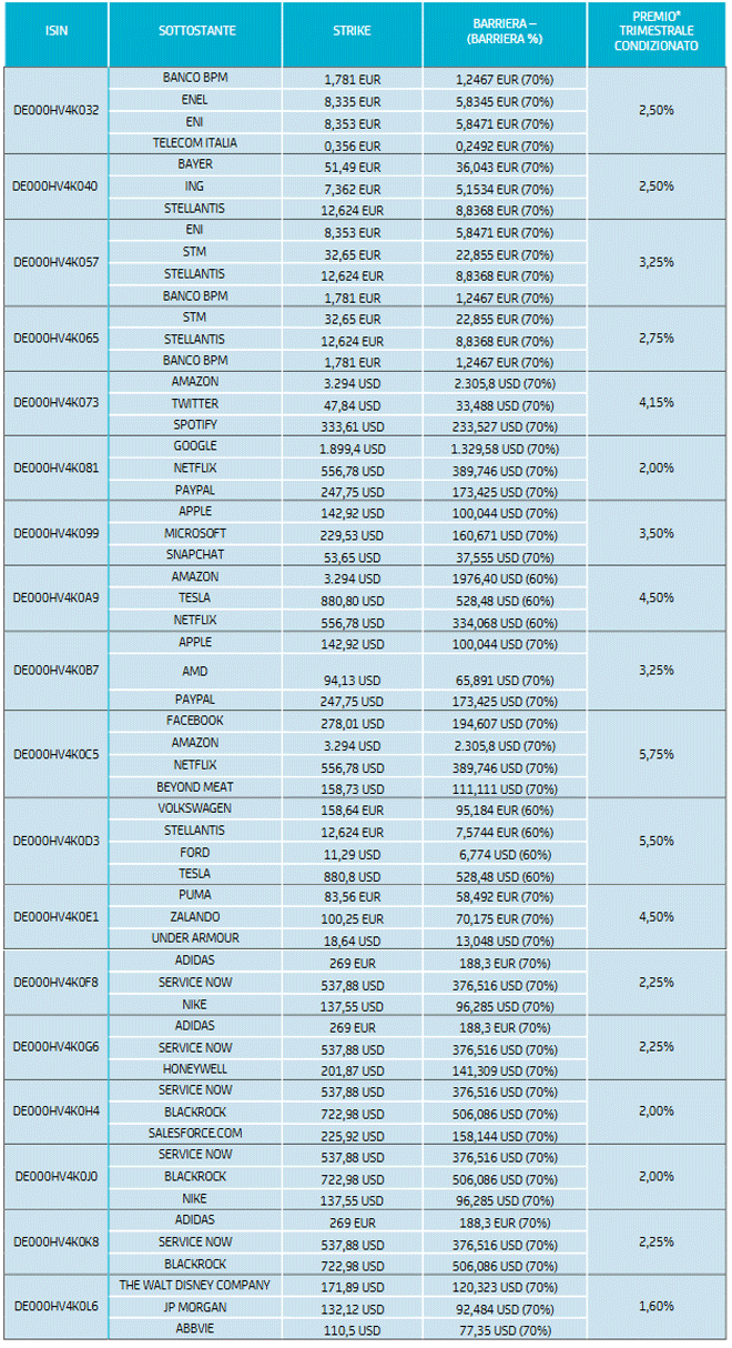 I nuovi Certificate hanno come sottostanti panieri di azioni italiane e internazionali, una scadenza a 2 anni (gennaio 2023) e pagano un premio trimestrale condizionato che va da un minimo dell’1,60% ad un massimo del 5,75% a seconda dei panieri.