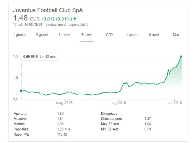 Senz’altro alle spalle di questo rally c’è anche una dose di speculazione, sta di fatto che da inizio luglio, le azioni della Juventus valevano soltanto 65 centesimi. Le indiscrezioni relative al possibile arrivo di CR7 spinsero il titolo verso quota 0,90. Ne è seguita una rapida pausa, con una correzione verso 0,76, preludio ad un nuovo ed imponente rally, capace di spingere il titolo dapprima a superare quota 1 euro e successivamente verso i record degli ultimi 15 anni a 1,20. Ieri, poi, le azioni della società di Corso Galileo Ferraris hanno toccato nuovi massimi a 1,635, prima di correggere verso 1,50.