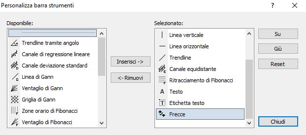 Questi strumenti sono invece delle linee orizzontali e verticali. La prima è utile quando si marca la data o l’orario sul grafico. La seconda viene usata per l’applicazione del livello del supporto e della resistenza. Ti permette anche di selezionare i livelli psicologici sullo strumento da te scelto.