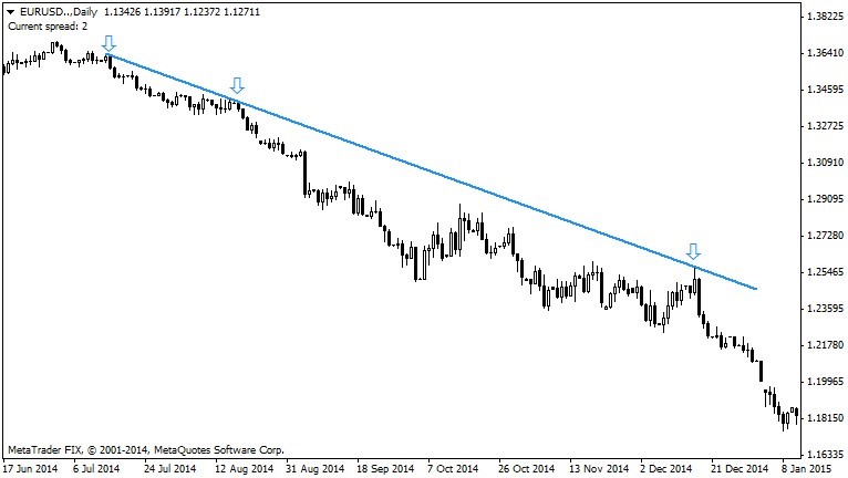 Prima di iniziare a tracciare la trendline dobbiamo localizzare i movimenti di prezzo più estremi. Allora mettiamo una trendline sul primo prezzo massimo in un trend decrescente. Il secondo punto verrà applicato in modo tale che la linea non vada ad intersecare le candele che ci sono tra i due punti. Ricordiamo che una trendline applicata correttamente viene tracciata ai prezzi massimi, i cosiddetti stoppini delle candele, invece che sui prezzi di chiusura. Quando il prezzo rimbalza su dalla trendline mappata, ciò sarà una conferma della forza della trendline.