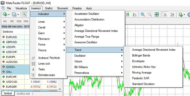 Tutti gli strumenti di analisi tecnica sono raggruppati nel menu “Inserisci”.