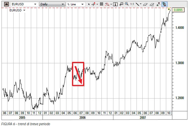 Si osservi che mentre il trend di medio periodo si stava muovendo lateralmente, quello di lungo periodo si stava ancora muovendo al rialzo. Come abbiamo detto, i trend in genere si muovono gradualmente nel senso che raramente salgono o scendono in modo repentino.