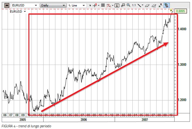 I trend di lungo periodo, a volte chiamati tendenze primarie, sono quei trend che hanno dominato più a lungo il grafico. Se esaminate il seguente grafico della coppia EUR/USD, potete vedere che essa ha seguito un trend al rialzo da sinistra a destra: notate la serie di punti di massimo e di minimo crescenti man mano che passa il tempo (FIGURA 4).