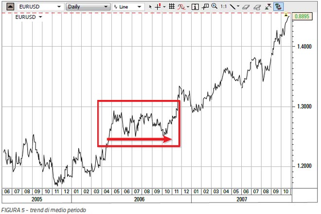 Se esaminate questo grafico della coppia EUR/USD, potete vedere che essa ha seguito un trend di medio periodo laterale durante l'arco temporale evidenziato: anche qui notate la serie di punti di massimo e di minimo man mano che passa il tempo (FIGURA 5).