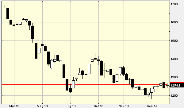 Qui sotto il grafico del mercato dell’oro degli ultimi 12 mesi con barre settimanali.