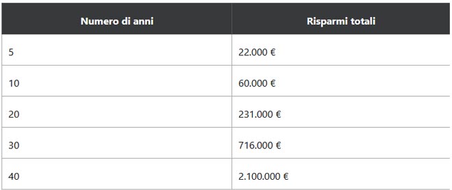 Andando avanti in questo modo dopo 5 anni si avrà nel portafoglio di investimento la somma di 22000 euro come indicato in tabella.