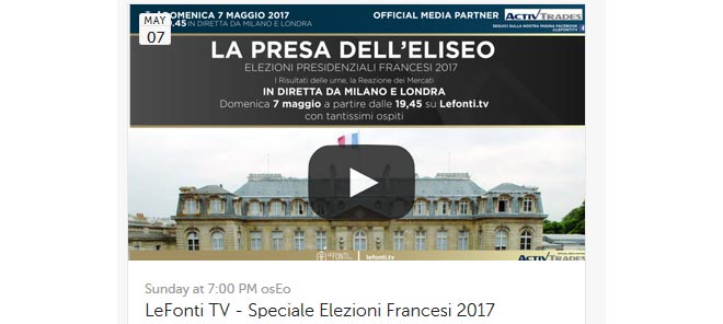 Il secondo turno si avvicina e non mancheranno occasioni di trading sui mercati finanziari. Segui la diretta e l'impatto del risultato del voto in diretta streaming con ActivTrades (domenica 7 maggio a partire dalle ore 20:00 al seguente link: https://livestream.com/lefonti/france2017)