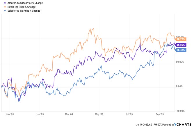 I titoli growth hanno toccato il fondo dopo una performance pessima da inizio anno. Azioni come Amazon (AMZN), Netflix (NFLX) e Salesforce (CRM), che erano state schiacciate fino a quel punto, hanno raddoppiato da metà ottobre 2008 a metà ottobre 2009.