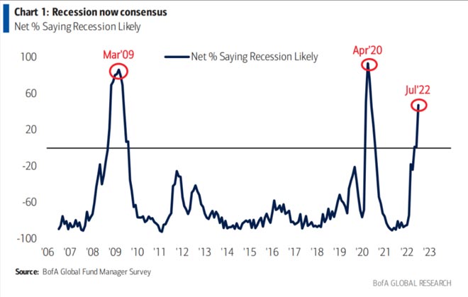 In quel sondaggio di luglio 2022, la percentuale di gestori di fondi che ritengono che una recessione sia probabilmente aumentata a oltre il 50%. In effetti, la maggior parte ora crede che una recessione sia probabile.