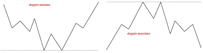 Anche per questa figura è possibile determinare l’obiettivo calcolabile come distanza tra i massimi e i ripiegamenti. Stesso discorso, ma con obiettivo rialzista, vale per la figura di Doppio – o Triplo – Minimo.