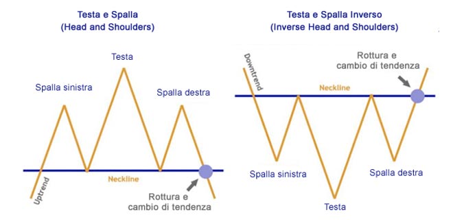 Una tra le più importanti figure d'inversione è il cosiddetto “testa e spalle” (head and shoulders). E’ caratterizzata da una prima fase di rialzo con forti volumi seguita da una correzione al ribasso accompagnata da bassi volumi, a costituire la “spalla sinistra”.
