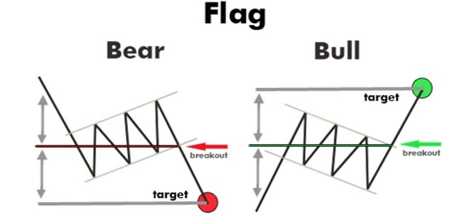 Le formazioni a bandiera hanno la forma di un parallelogramma, con inclinazione opposta alla direzione del trend ). Si tratta perciò di una breve correzione, cioè di un trend di ordine inferiore (più breve) opposto al trend principale. Che sia un trend vero e proprio è confermato dal fatto che i massimi ed i minimi sono entrambi crescenti o decrescenti. (esattamente come i wedges).