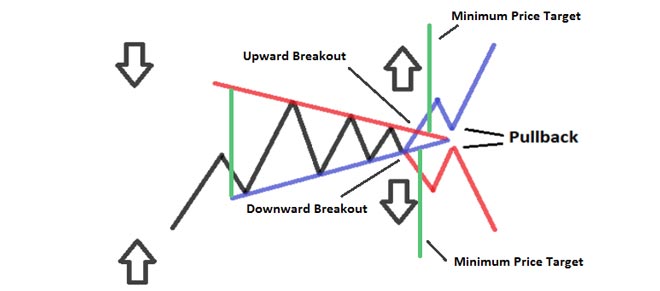 Alcune volte, dopo la rottura avviene un pull back, ovvero un movimento di ritorno, verso il triangolo: è necessario che i volumi siano molto bassi in tale fase, e che risalgano quando il movimento riprende nella direzione della rottura, cioè del trend dominante. La formazione a triangolo è molto frequente e si risolve in tempi più brevi della formazione a rettangolo.