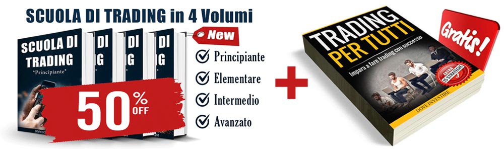 La promozione include 4 ebook suddivisi per Principiante, Elementare, Intermedio, Avanzato e l'ebook sul trading più venduto di sempre “Trading per Tutti“. Tutto questo ad un prezzo mai visto prima ma solo per poco.