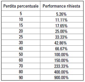 Mettiamo in una tabella i livelli di perdita percentuale e la performance che sarà richiesta al capitale residuo per reintegrare l'importo del nostro investimento iniziale: all'aumentare della perdita è necessaria una percentuale sempre più elevata di profitti per il reintegro del capitale.